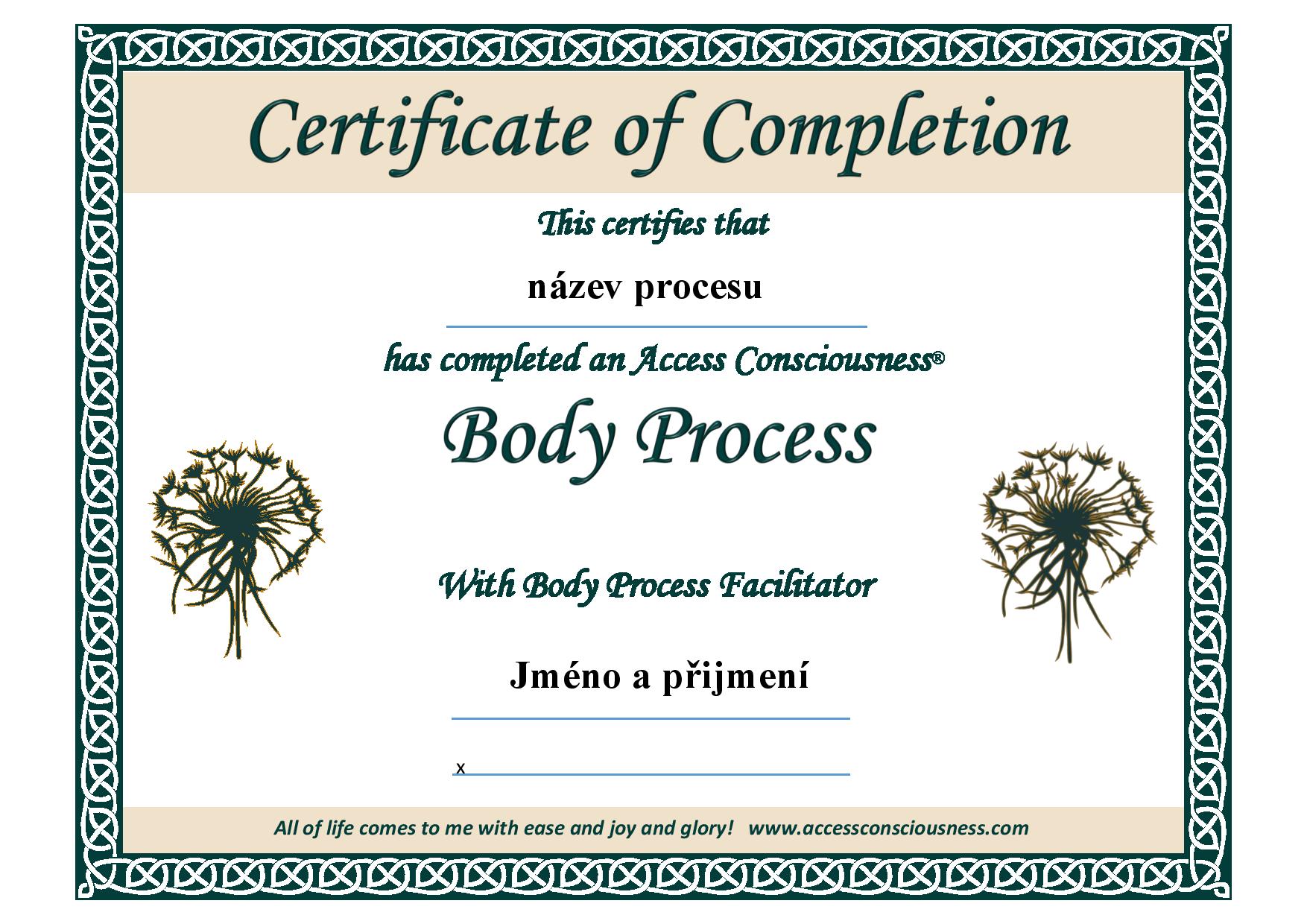 Cena 3 hodinového kurzu tělesného procesu pro rok 2021 Cena kurzu je 1.250,- Děti do 15ti let zdarma. Každý absolvent kurzu obdrží certifikát společnosti Access Consciousness. |